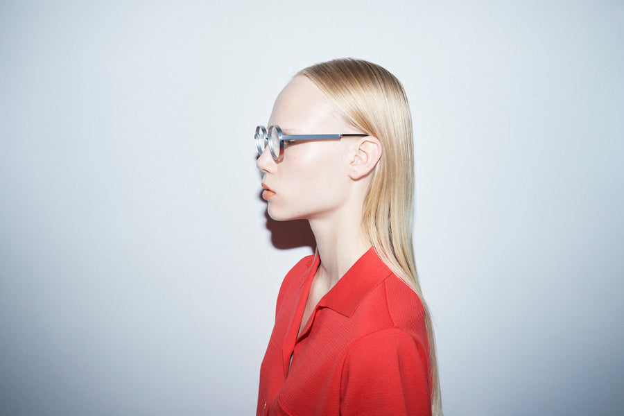 TWO FACE is eyewear that features unique lines created by assembling flat metal in three dimensions. It offers different appearances of the wearer when seen from the front and from the side. The bold shape of the lens is defined by the design and structure that adds character to the look.