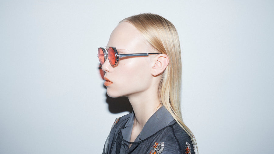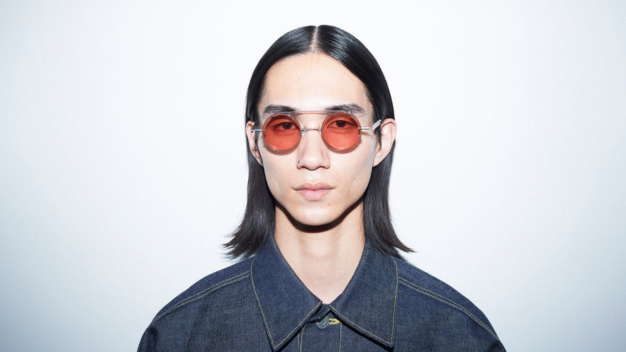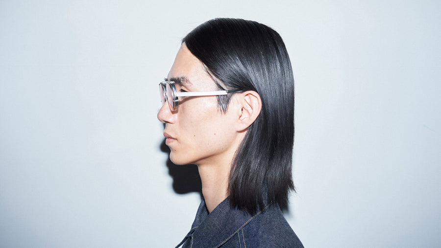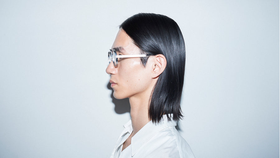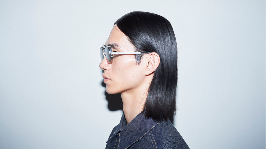フラットな金属が次元の空間で組み上がることで独特のラインを作り上げたアイウエア「TWOFACE」。正面と側面から見たかけ姿の印象が変わるといった性格を持っています。そして大胆なレンズカットによるデザイン。設計と構造が生み出した必然性でカットされたレンズの形状が一つのアクセントとなっています。